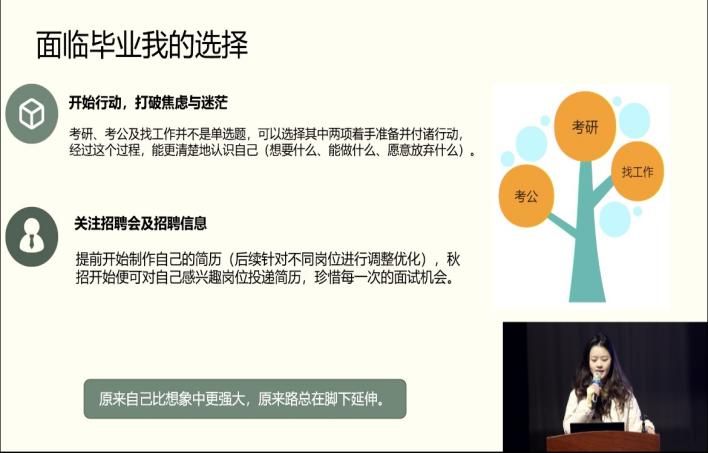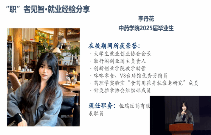 在就业经验分享环节,中药学院25届毕业生李丹花结合自己在恒瑞医药有限公司从事医药代表的经历,分享了她的职业理解。她表示,医药代表不仅是药品的推广者,更是医药信息的传递者与临床服务的支持者,帮助大家厘清了将医药
