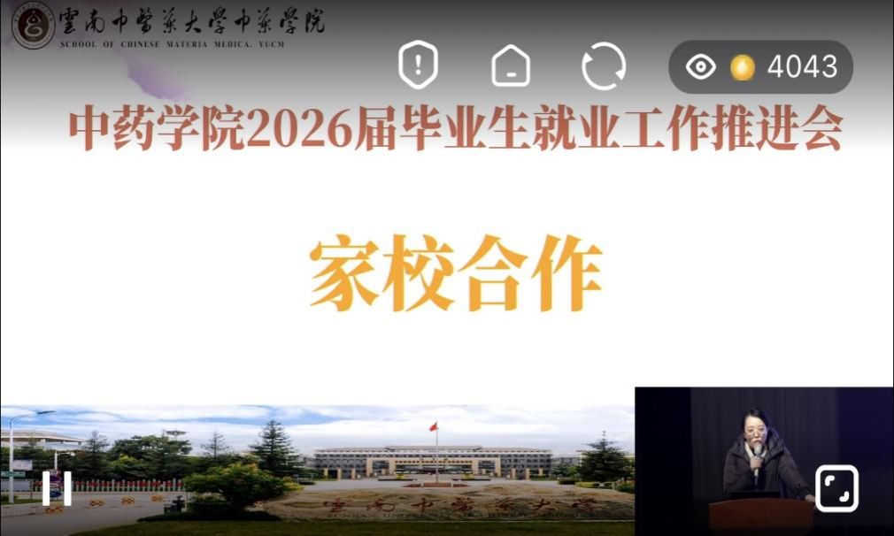云中讯(通讯员 张艾) 为扎实推进毕业生就业工作,加强家校联动,助力学生顺利就业。1月8日晚,学校就业创业指导中心、中药学院在兰茂堂召开2026届毕业生家长会暨就业工作推进会。会议采取线上线下相结合的方式,就业创业指导中心领导、中药学院全体党政班子成员、毕业班辅导员、班主任、学业导师,与学院2026届毕业生、部分低年级学生和家长共计6000余人参会。