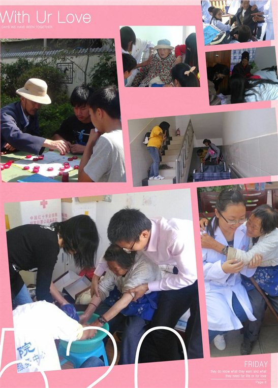 活动前期,我们联系了养老院的负责人,确定了活动时间,我们还准备了节目表演,并对参加活动的同学进行分组培训。10月26日下午1点半,我们到达呈贡新区第一养老院之后,大家积极布置场地,准备表演节目。同学们准备的节目表演有太极、手语、合唱、乐器演奏及舞蹈等10个节目,其中《纤夫的爱》,《好日子》等歌曲都是老人们熟悉的,有的老人还跟着哼唱,特别在表演太极拳的时候,几个老人还跟着做动作,节目获得了老人们的一阵阵掌声。节目表演完毕,志愿者们各司其职,诊疗组成员备好血压仪帮老人们量血压,并细心向他们说明自己的血压情况及用药和饮食禁忌,其他志愿者用熟练的手法帮老人们按摩四肢,帮助他们疏通四肢筋络;交流组成员热心地与老人们聊天,耐心倾听他们讲过去的故事,老人跟我们分享他们年轻时的故事及他们在养老院和家里发生的趣事,大家都聊得很开心,现场其乐融融;后勤组成员负责打扫院内及老人的房间,帮助老人洗衣服和铺床,在大家的共同努力下,院内每一角都干净整洁,获得了老人们的赞扬。最后,孙院长向我们致感谢辞,志愿者与老人们合影留念,此次活动圆满结束!