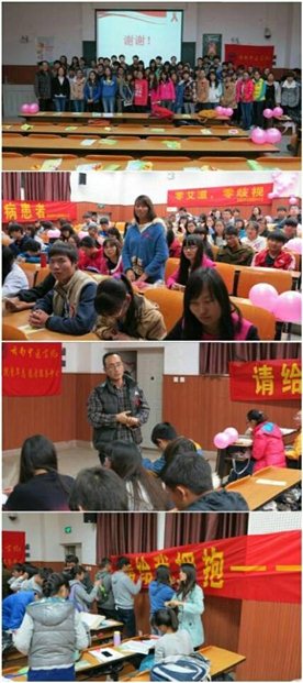 晚上在1209教室,药学院王睿睿老师为同学们做“行动起来,向零艾滋迈进”的主题讲座。“艾滋病的死亡率是百分百”、“艾滋病目前还没有治愈的药物和方法,预防是关键”、“现在,性传播是艾滋病传播的主要方式”、“与艾滋病人及艾滋病病毒感染者的日常生活和工作接触不会感染艾滋病”、“艾滋病不会经咳嗽、打喷嚏、蚊 虫叮咬等途径传播”。王老师给大家带来了丰富的关于艾滋病及艾滋防治方面的知识。 本次活动通过展板展示、悬挂横幅、发放印有艾滋病宣传知识的卡片等形式,向同学们宣传、普及艾滋病防治知识和国家有关政策,倡导健康生活方式,号召同学们积极行动起来,关心和参与艾滋病防治工作,有效遏制艾滋病的传播蔓延。