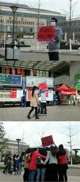 “我是艾滋病患者,可以给我一个拥抱吗?”午饭时间,药学院志愿者们分别在弘毅楼、二食堂及紫竹苑门口装扮成“艾滋病患者”,在校园求拥抱、发放防艾资料,鼓励人们消除歧视,正确认识艾滋病的传播途径。