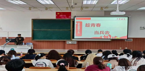 杨雯婕以“趁年轻,当兵去”为主题分享军旅故事。她用生动的细节讲述军营生活,点燃学生们的参军热情。随后她详细解读2024年征兵政策,围绕报名流程、体格检查、学籍保留、升学就业优惠等政策要点进行讲解,并针对学生关心的退役后学业衔接、经济补助标准等问题逐一答疑。她鼓励在场学生,把青春热血融入强国强军征程,让生命在绿色军营中绽放光彩。