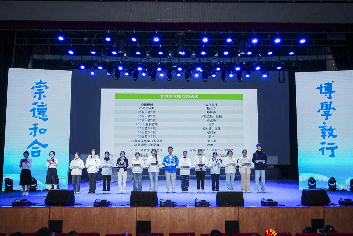 责任田交接仪式成为文化传承的生动注脚。在全场师生见证下,2023级与2025级班级代表完成党建百草园责任田交接。与此同时,基地管理教师开展了药用植物栽培管理制度培训和中草药栽培技术培训,为新生注入传承的“技能基因”,确保了责任田管理的专业性与延续性。