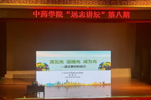 云中讯(通讯员 张艾)9月26日下午,中药学院“远志讲坛”第八期讲座在兰茂堂举办。本期讲座特邀我校优秀校友——个旧市中西医结合医院团委书记、第七党支部书记李美玲担任主讲嘉宾,中药学院党政领导和教师、学生代表共计600余人参加讲座。